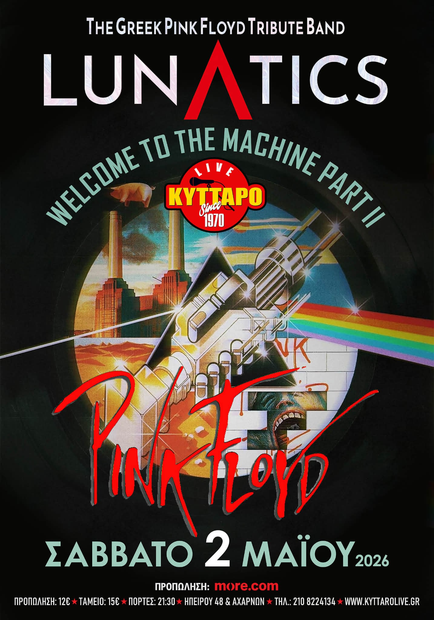 The Lunatics are a "Pink Floyd tribute band" from Athens Greece. They were conceived and formed in 2010, by George Makaris, and aimed to perform "the dark side of the moon" in its entirety, alongside a selection of tunes from the band's rich back catalogue, while retaining the distinctive elements of sound and style that gave Pink Floyd their legendary status. Thus, a group of 12 talented musicians began rehearsing to achieve this goal and 1 year later, in June 2011, they played their first ever show. Since then, they have successfully performed at several venues and festivals. This year they will be performing as a seven-piece band, a set-list consisted of songs from the following albums: The Piper At The Gates Of Dawn - A Saucerful Of Secrets - Atom Heart Mother - Meddle - Obscured By Clouds - The Dark Side Of The Moon - Wish You Were Here - Animals - The Wall. Lunatics will take us to a ride through all these wonderful songs of Pink Floyd, that we all have loved.